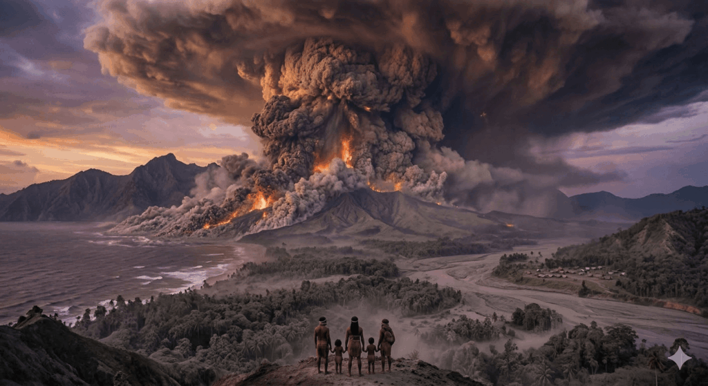 今から7万5000年前、インドネシアのスマトラ島で島の西側にあるトバ火山の大噴火が起きました。巨大噴火は長さ100km、幅30kmに及びました。火山噴出物(硫酸エアロゾル)はおよそ10日間で地球を一周し、塵が厚い層となって地球全体を覆いました。太陽の光が遮られた地球は、2年で平均気温を12℃下げたといわれています。