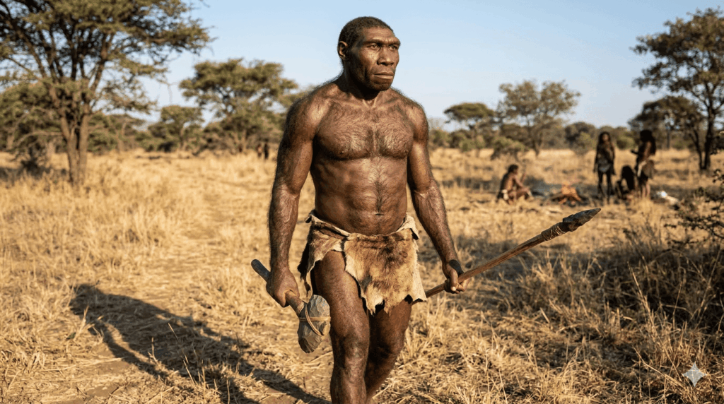 アフリカ大陸の気温の暑さゆえに身体を保温する必要がなかったため、次第に原人の体毛は失われていきました。「ホモ・エレクトゥス」は石器をより高度に加工し、槍なども作っていました。ホモ・エレクトゥスが加工した道具はそれまでのホモ・ハビリスが加工したものとは異なり、石の両面が削られて先端が鋭利に尖っている特徴を持っていました。こうした両面加工石器の刃渡りは、それ以前のものよりも最大で4倍も長く、木を叩き切ったり根を掘り出したり、または動物をさばいたり皮をはいだりするのに適していました。