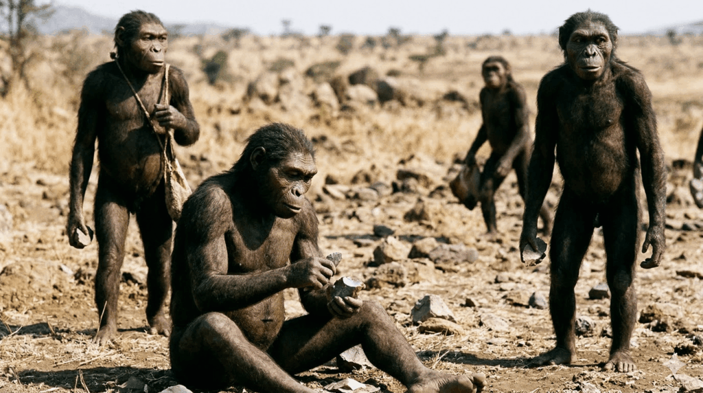 250万年前~150万年前にかけて、気候の乾燥化によって多雨林が熱帯性の乾燥林や移行帯のサバンナ林地となりました。サバンナ林地では樹上と異なり外敵から身を守るために遠くを見渡す必要性があっため、種の保存のためには安定した二足歩行が求められるようになりました。また、環境が乾燥化することによって食糧が減少したため、食糧を確保する手段も求めるようになりました。そこで、人類の祖先である「ホモ・ハビリス」は、地中から食糧を調達するために根や塊茎を掘る道具を作りだしました。この頃になると、狩った動物の肉を骨から削ぎ落とすために、鋭利に尖った石器も知的に用いていました。
