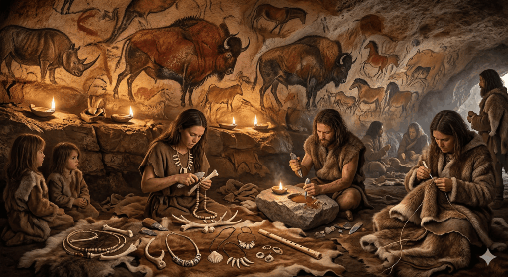 動物の骨や牙・角を利用して、装飾品や縫い針、油を燃やすオイルランプなどが作られるようになりました。また、ネックレス、ペンダントヘッド、フルートなども作りだしました。2万5000年前には、動物の油を用いて絵の具を作成し、洞窟の壁に様々な色で牛の絵を描くようになりました。そうした壁画には、洞窟内の岩の凹凸を活かして立体感を出す工夫が施されていました。また、2万4000年前には土を用いて像なども作り出すようになりました。
