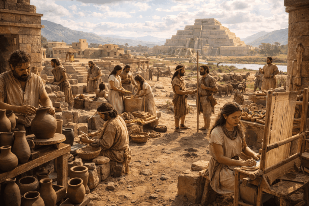 食糧の生産や備蓄が可能となったことから、食糧の生産に関わらない仕事が登場しました。いわゆる「職人」の登場です。焼き物や宝飾品、布を作成する技術者や、豊作を願い、災いが起きないように祈る神官や呪術師も登場しました。食糧に余裕が生じ、移動せずに生きていけることから人口が増加し、取引、商人も登場しています。