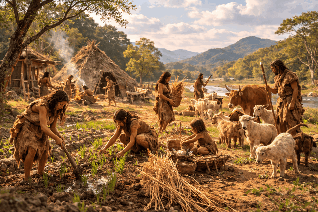 世界各地へ散っていった人類は、それぞれの地で狩猟・採集生活を行うようになりました。1万2000年ほど前になると、人類は自分たちにとって利益になる動物や植物を選んで増やす「人為選択」を覚えました。土地を耕し、植物を栽培し、動物を繁殖させることで農耕と牧畜生活がはじまりました。これにより、安定的に食糧を確保できるだけでなく、定住生活が可能となりました。