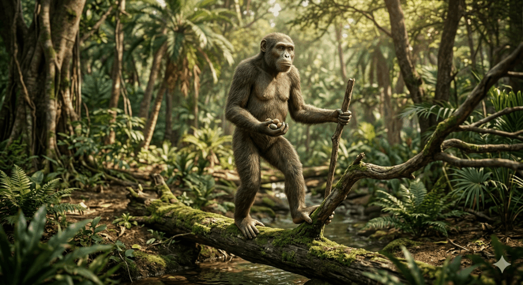 アフリカの湿潤な森に生息していた「アルディピテクス・ラミダス」は、人類の脳が爆発的な巨大化を遂げる直前の「進化の分水嶺」を象徴する存在です。身長は120cm、頭蓋容量は300cm^3程度でした。まだ顕著な脳の大型化は見られませんが、直立二足歩行という新たな行動様式が確立されたことで、手が「移動のための器官」から「操作のための器官」へと役割を変え始め、後の道具使用や複雑な行動を可能にする土台が築かれていきました。一方、直立歩行をすることなく森に留まった種族は、その後は脳が拡大することなく現在のチンパンジーやボノボへと進化していきましたた。このようにアルディピテクス・ラミダスは、脳の拡大そのものよりも「脳が進化する条件」を整えた転換点として、重要な存在といえます。
